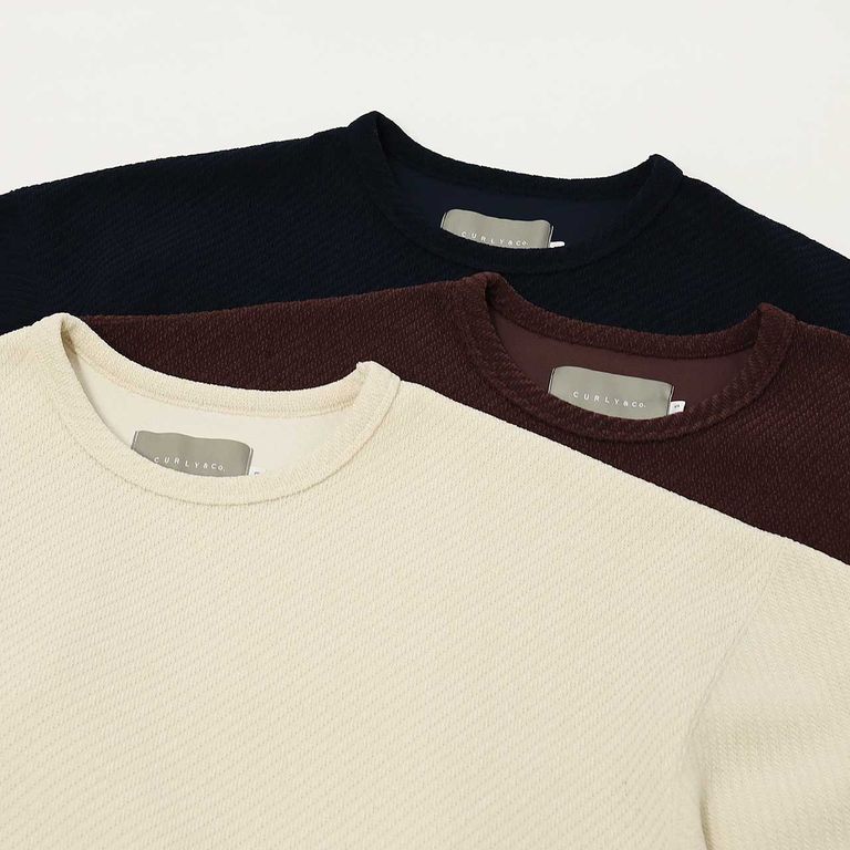 リサイクルポリエステルのモール糸で編み立てた、表と裏の見え方が異なるクウォーターゲージニットを用いたクルーネックプルオーバー。温かみのある肌触りと太めのツイル模様が特徴のダンボールニットは、膨らみがありながらも軽量。表面は暖かく起毛されていますが内側はサラッとしているので、インナーと摩擦することなく滑りが良いので着心地も優れています。全体のシルエットはオーセンティックなバランスですが、後ろ身頃の裾のみストレッチバインダーで丸みを出しています。ウエスト部分にはシームポケット有り。袖口にサムホール付き。