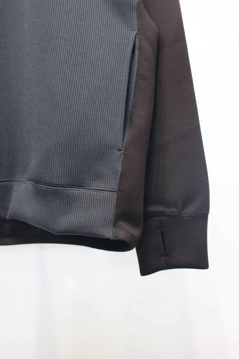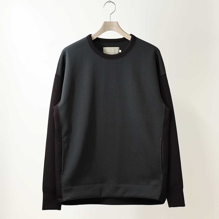 フロント部分に異素材ニットを使用したダンボールニットのクルーネックプルオーバー。ポリエステルをベースにレーヨンとポリウレタンが高混率された、柔らかく優しいダンボール素材は、適度なシルエットを保ちつつもストレスフリーな着心地をもたらしてくれます。前身頃のみにストライプ畝のニット見えする同系色のクォーターゲージニットを使用し、リラックス感の中にも凛とした表情を見せてくれます。シルエットは適度なゆとりを持つオーセンティックなバランス。ウエスト部分にはシームポケット有り。袖口にサムホール付き。
