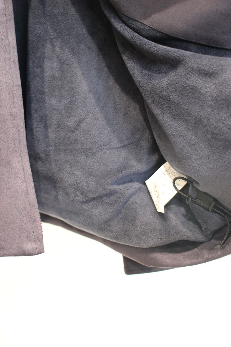 リサイクルポリエステル原料のダンボールスエードを用いたジップアップブルゾン。リラックス感のあるゆったりとしたシルエットなので程よいドレープが生まれ、スエード生地特有の陰影が綺麗に出ます。身頃には薄手のフリースを、袖には滑りの良いトリコット裏地を用いています。裾にはドローコードがあるので、ブラウジングしてシルエット変化を楽しめます。前袖はシャツ袖で後ろ袖がヨークスリーブのスプリットスリーブ仕様。左身頃の胸にはシームポケット、右身頃の裾内側にはパッチポケット有り。