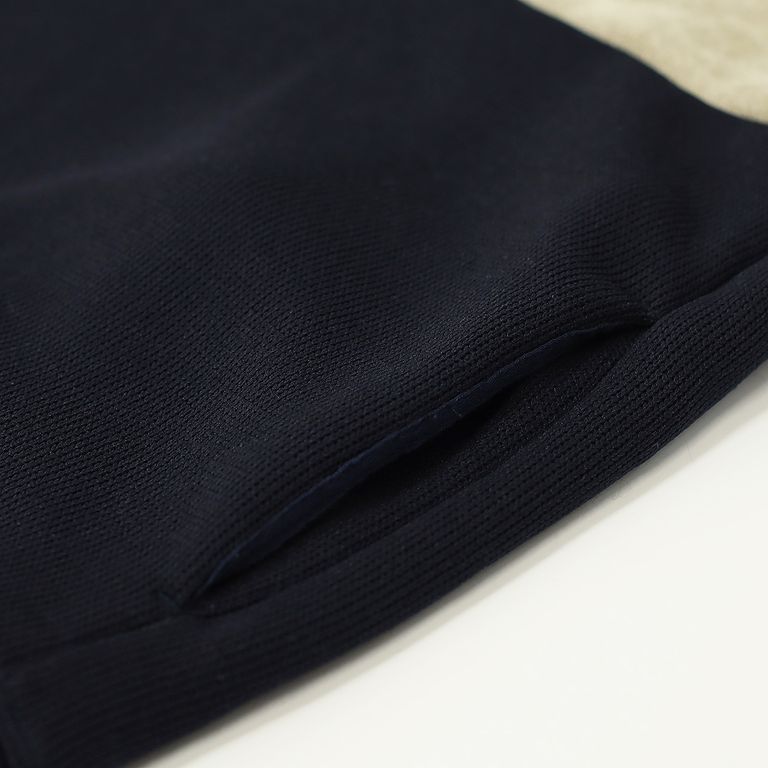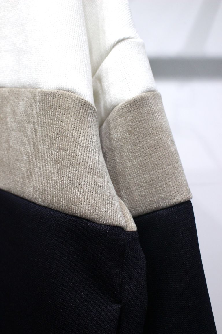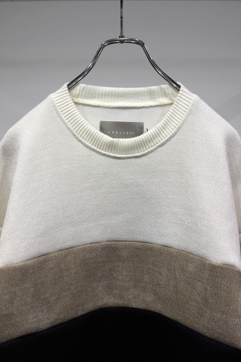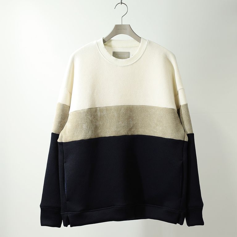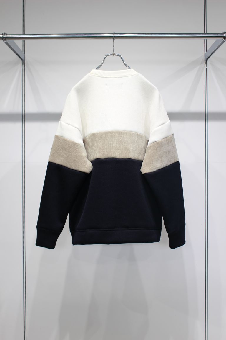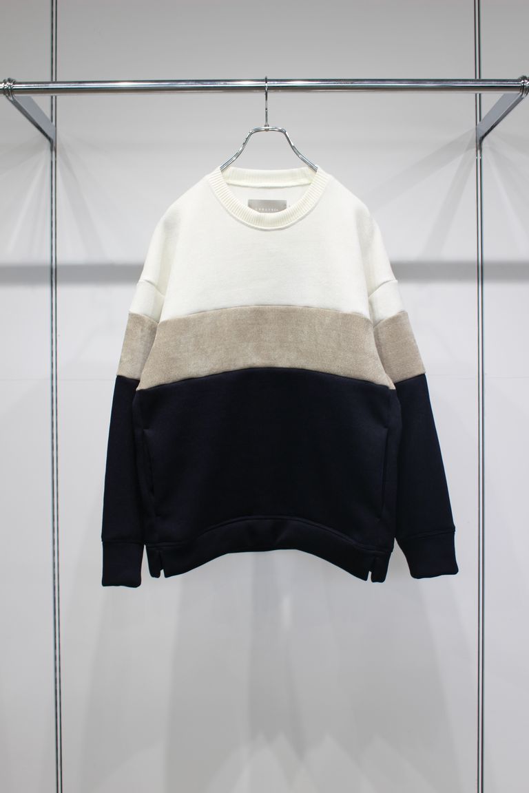 3色を切り替えたダブルフェイスジャージーのクルーネックプルオーバー。前身頃だけでなく後ろ身頃も袖も全て切り替えたダイナミックなデザインは、ノルディックセーターとラガーシャツからインスピレーションを受けて抽象化したもの。ダブルフェイス素材の特徴を活かし部分的に表面と裏面を使い分けることで、起毛されたモール糸の柔らかい表情が強く引きでています。形はシンプルな程よいゆとりのあるシルエット。ウエスト部分にはシームポケット有り。