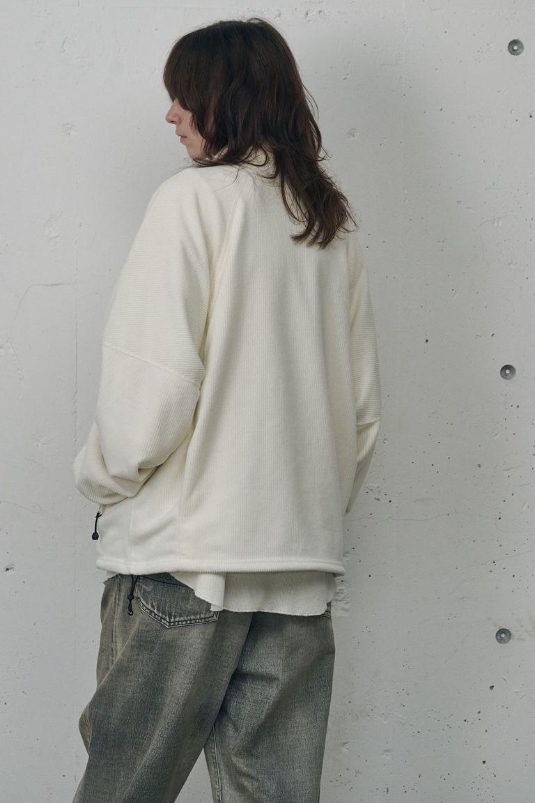 細かく毛羽立てたマイクロフリースの表面に、畝を並べることで凹凸から陰影が生まれ、着用時により強い立体感が現れます。