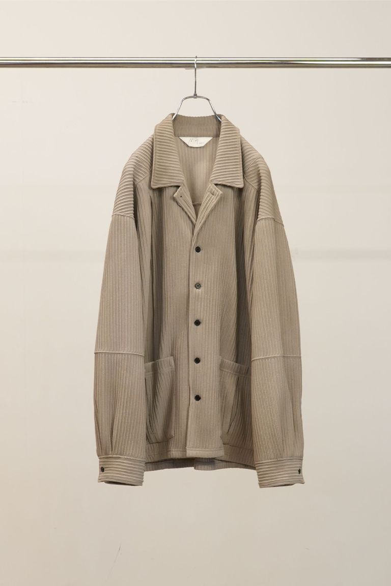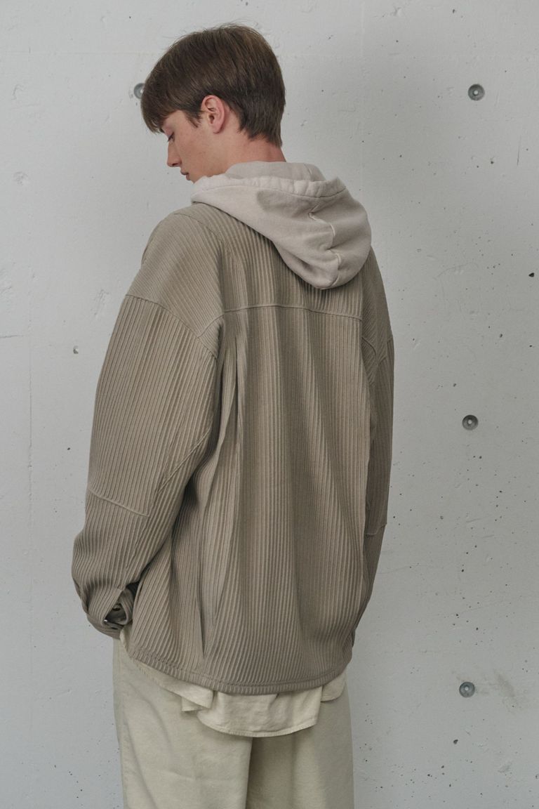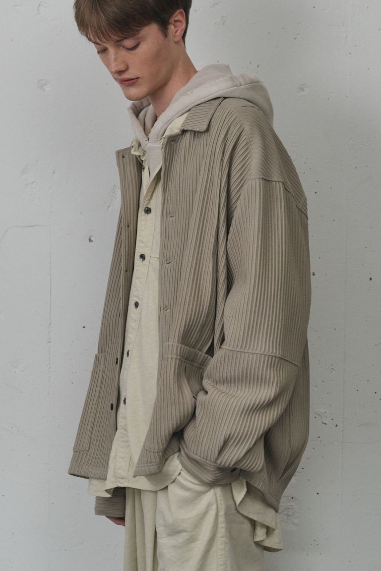 畝をストライプに見立てながら、立体感の強い生地に合わせて形状はシンプルに設計。シャツとカバーオールの間を取り、羽織りとしてもお使い頂ける量感を狙いました。