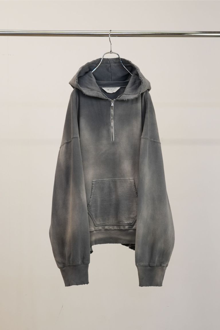ハーフジップのスウェットフーディ。