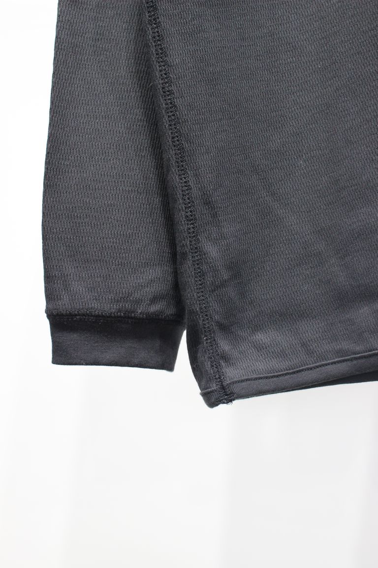ハニカム組織で編まれたジャージー素材を用いたシンプルなプルオーバー。いわゆるサーマルと呼ばれるベーシックアイテムですが、コンパクトヤーンという特殊な紡績技術を使用して作られる糸を用いる事で、通常よりも毛羽立ちも少なく、糸の太さも均一なため自然な光沢感もあり、カジュアル過ぎない仕上がりになっています。裾始末は通常オーバーロックでラフにされがちですが、フライスのバインダー仕立てにしているので1枚での着用もお薦めです。ロンT以上スウェット未満的なアイテムです。