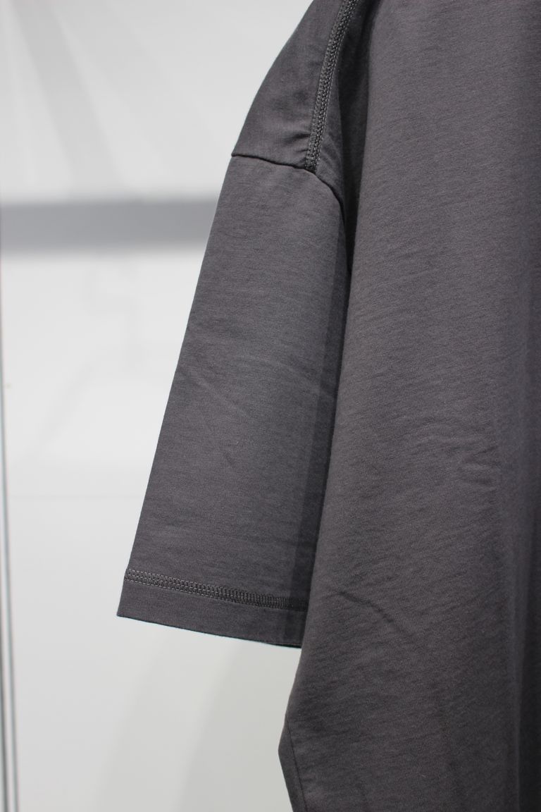 プレーティング天竺を用いたベーシックなクルーネックTシャツ。40番単糸を使いながらも撚り方向を変えた糸をプレーティング仕様にする事で、洗濯後の安定性を改善しています。染工場と薬剤メーカーが協力し水の使用量やCO2排出量が軽減される環境配慮型の工程を経て作られました。形自体はベーシックですが、繊維表面の保護膜や含まれる油分を必要以上に排除していないので、コットン本来の膨らみ感や柔らかさが残り、ふんわりとした肌触りの良いアイテムに仕上がっています。1枚着としてもジャケット下のインナーとしても活用できるシルエットです。