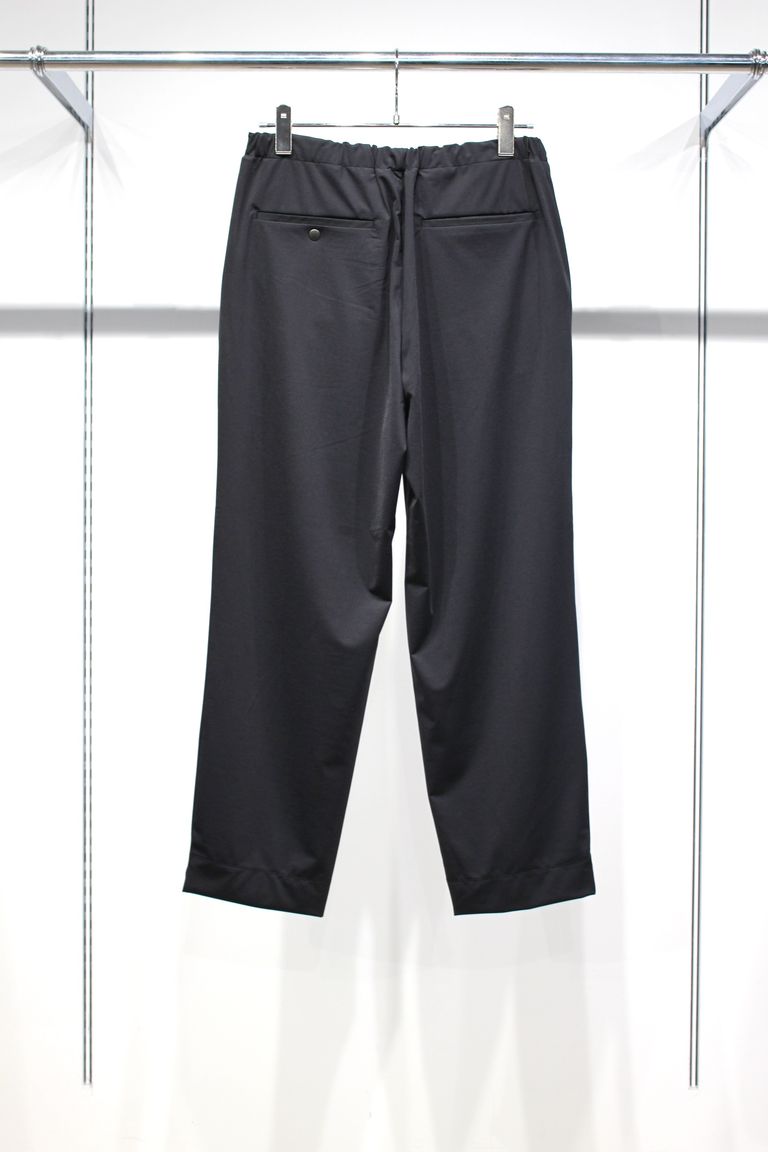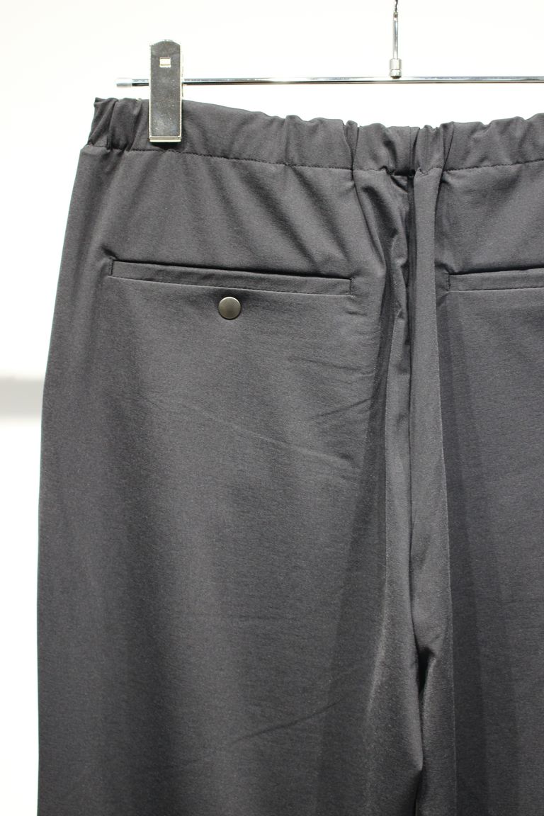 ストレッチナイロントリコット素材を用いたEZパンツ。32ゲージの高密度で編み上げ、ポリウレタンを高含有率にてブレンドしたため、50%を超えるストレッチを持ちながらもキックバックにも長けています。スラックスベースのテーパードシルエットなのでラフになりすぎず綺麗にコーディネートがまとまり、また、シワにもなりにくく接触冷感機能もあるので、履き心地は抜群です。