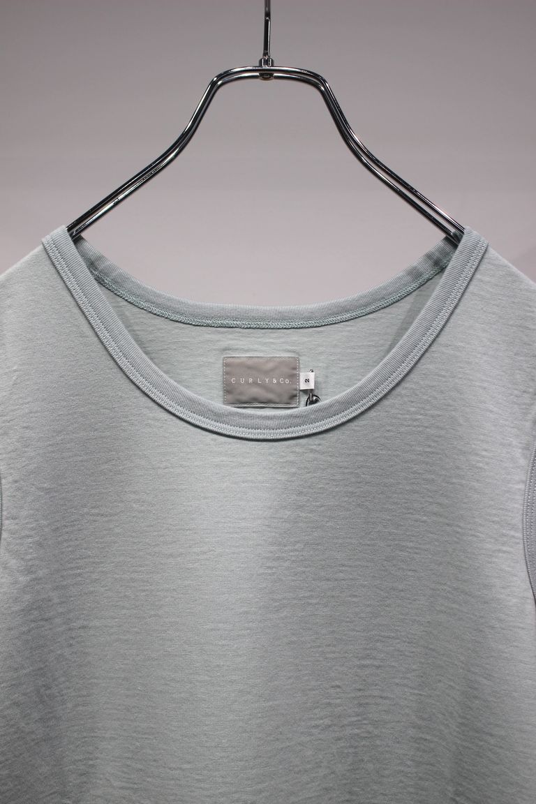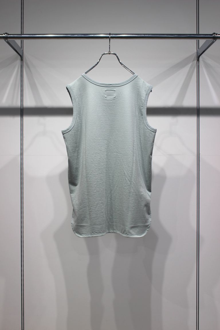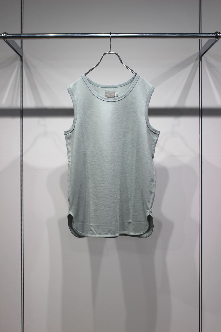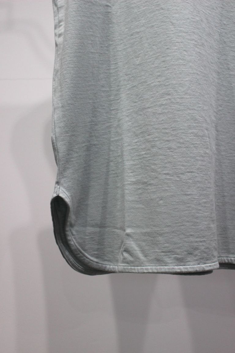 プレーティング天竺を用いたベーシックなタンクトップ。40番単糸を使いながらも撚り方向を変えた糸をプレーティング仕様にする事で、洗濯後の安定性を改善しています。染工場と薬剤メーカーが協力し水の使用量やCO2排出量が軽減される環境配慮型の工程を経て作られました。形自体はベーシックですが、繊維表面の保護膜や含まれる油分を必要以上に排除していないので、コットン本来の膨らみ感や柔らかさが残り、ふんわりとした肌触りの良いアイテムに仕上がっています。裾を少し長めに設定しているのでレイヤード着用も楽しめます。