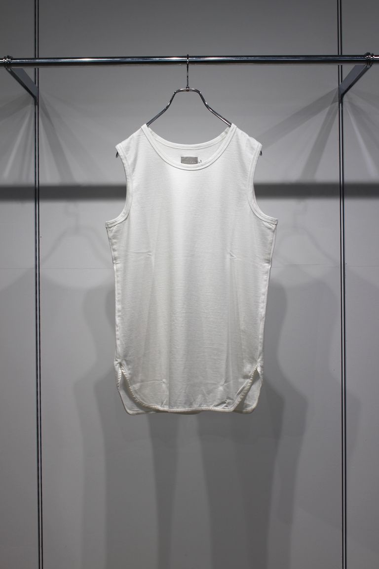 プレーティング天竺を用いたベーシックなタンクトップ。40番単糸を使いながらも撚り方向を変えた糸をプレーティング仕様にする事で、洗濯後の安定性を改善しています。染工場と薬剤メーカーが協力し水の使用量やCO2排出量が軽減される環境配慮型の工程を経て作られました。形自体はベーシックですが、繊維表面の保護膜や含まれる油分を必要以上に排除していないので、コットン本来の膨らみ感や柔らかさが残り、ふんわりとした肌触りの良いアイテムに仕上がっています。裾を少し長めに設定しているのでレイヤード着用も楽しめます。